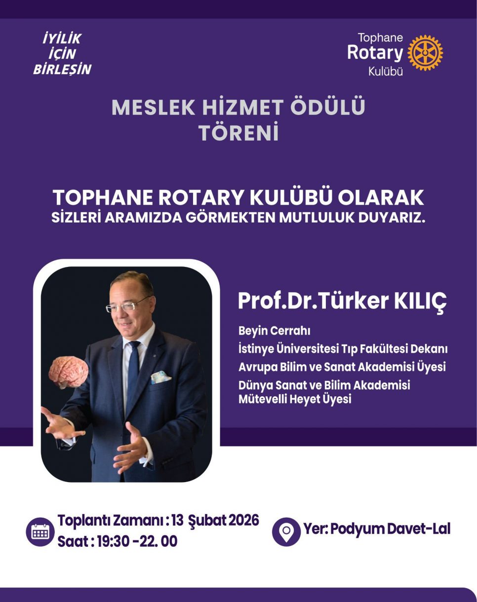 Tophane Rotary Kulübü tarafından 13 Şubat 2026 tarihinde düzenlenen törenle, beyin cerrahisi ve akademik alanda gerçekleştirdiği üstün çalışmalarıyla bilime ve insanlığa önemli katkılar sunan Prof. Dr. Türker Kılıç'a 2025-2026 Dönemi "Rotary Meslek Hizmet Ödülü" takdim edildi.